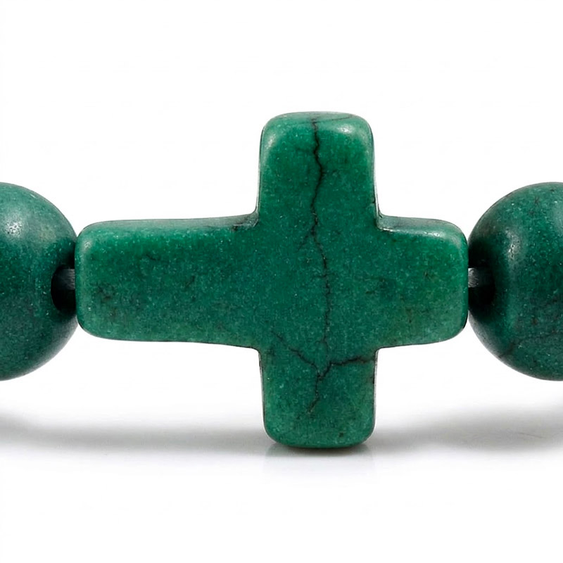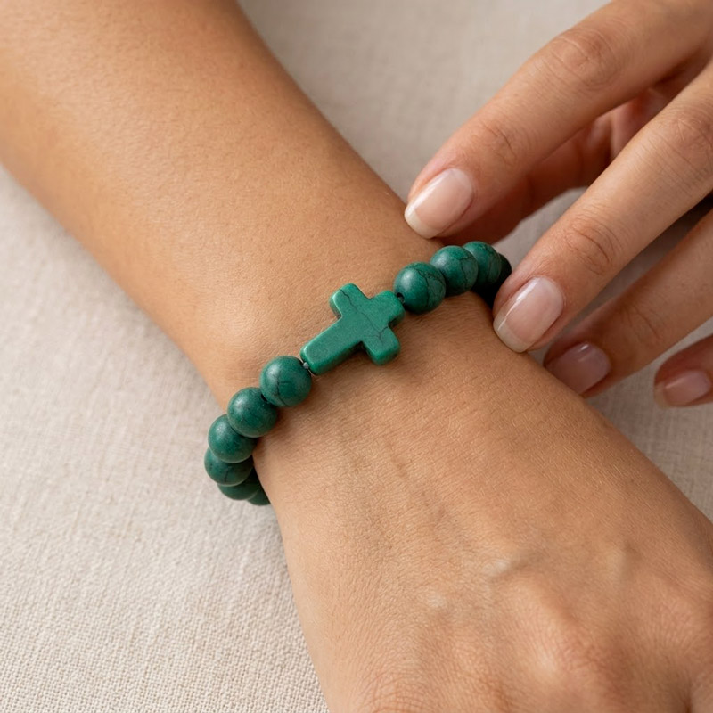 This piece leans more reverent than the lighter green editions. The deeper saturation, almost evergreen, pulls the bracelet out of casual stack territory and into something that feels considered. The upright Latin cross at the center is the form most associated with Western Christian tradition: a longer vertical bar, shorter horizontal arms, the silhouette carried in churches and worn close to the chest for centuries. Translated into stone and beads, it becomes a piece that travels easily from quiet morning prayer to the workday.