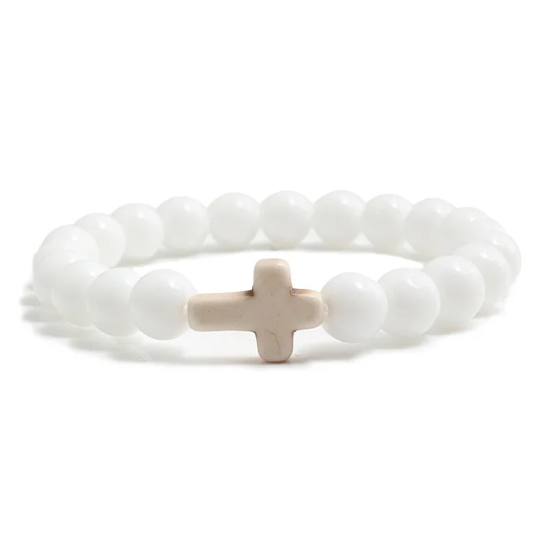 A clean, all-white beaded bracelet built around a single matte cross bead with natural stone veining, designed to sit quietly on the wrist as a daily act of faith.