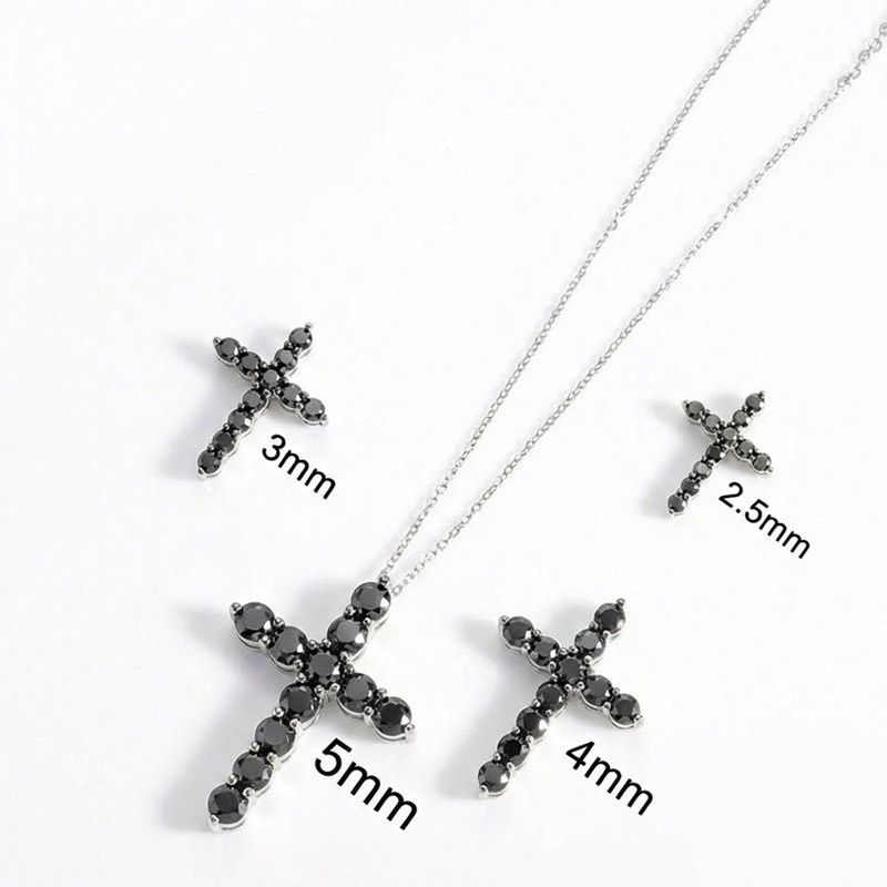 - Available in four stone sizes from 2.5mm (0.66 cttw) to 5mm (5.5 cttw), scaling from a discreet dark accent to a substantial gothic-inflected statement cross.