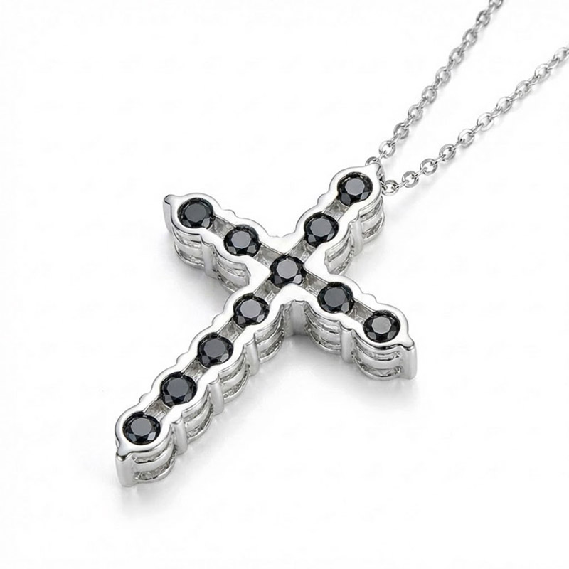 Eleven black GRA-certified moissanites set against polished white gold plating, creating a high-contrast cross that carries devotion with an edge most jewelry lines won't touch.
