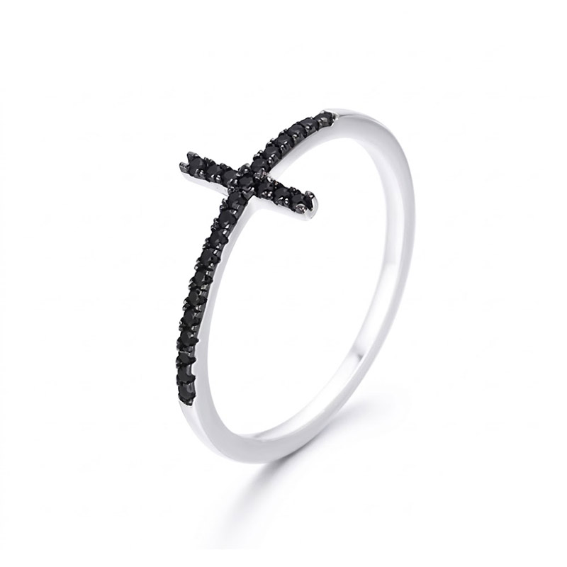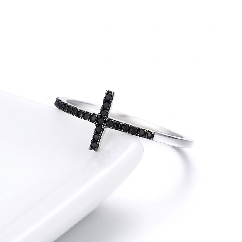 Black cubic zirconia stones set against a platinum-plated sterling silver band create a high-contrast cross ring that leans gothic without losing its refinement.