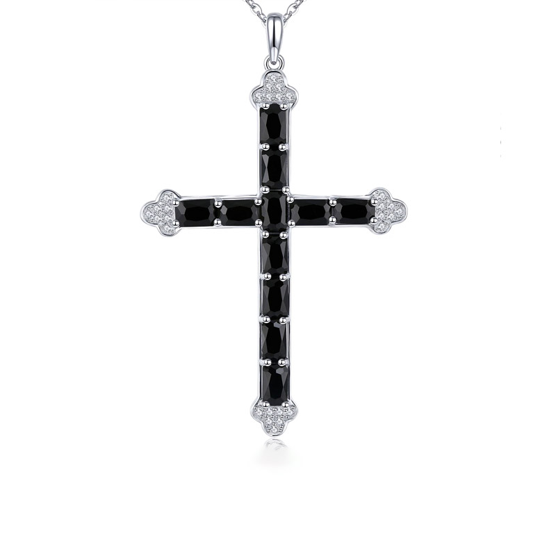 - Natural black spinel in octagon cut (0.20 x 0.12 in each), totaling approximately 3.5 carats across the full cross frame.
