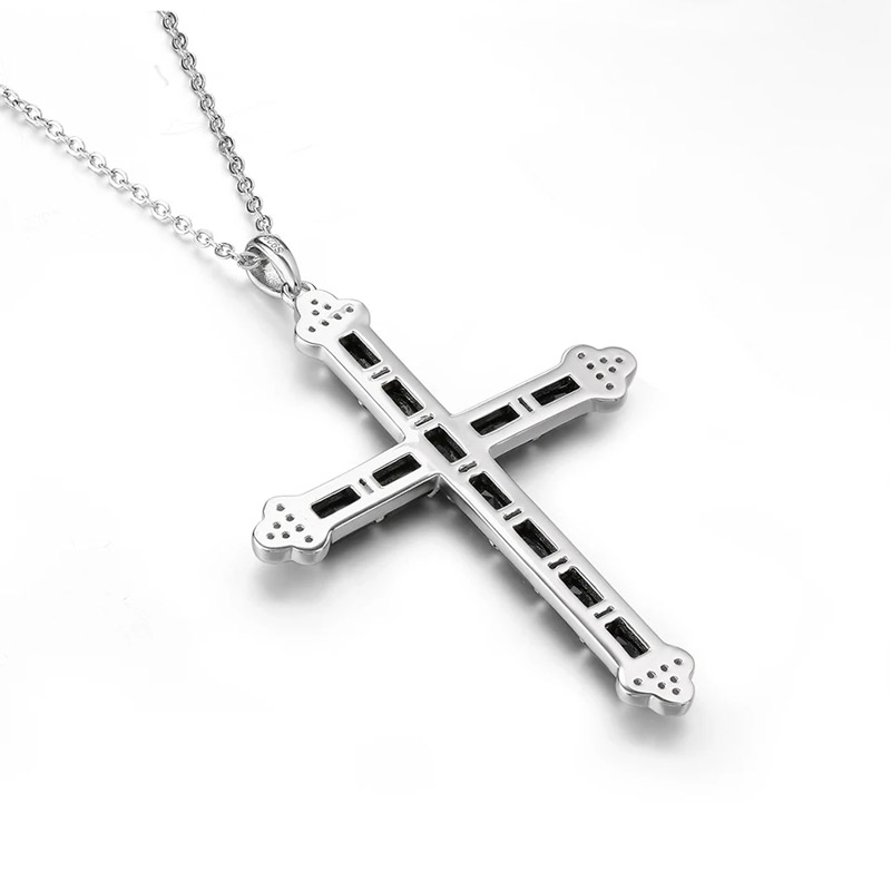 Black spinel is one of the most underrated gemstones in cross jewelry. Harder than onyx, more brilliant than black tourmaline, and naturally occurring without treatment, it delivers the kind of saturated black that synthetic stones struggle to replicate. Each of the thirteen octagon-cut spinels on this pendant is individually prong-set into a channel that runs the full length of both arms, creating an unbroken ribbon of dark stone bordered by polished silver rails. The rhodium plating over the 925 base adds a layer of practical protection: it resists tarnish, prevents skin reactions, and keeps the white-metal finish from yellowing over months of continuous wear. At 1.97 x 1.26 in, the pendant sits in that sweet spot between a subtle devotional piece and a true statement cross. It reads clearly at collar level on a crewneck, and it layers comfortably over a button-down or below a shorter choker chain.