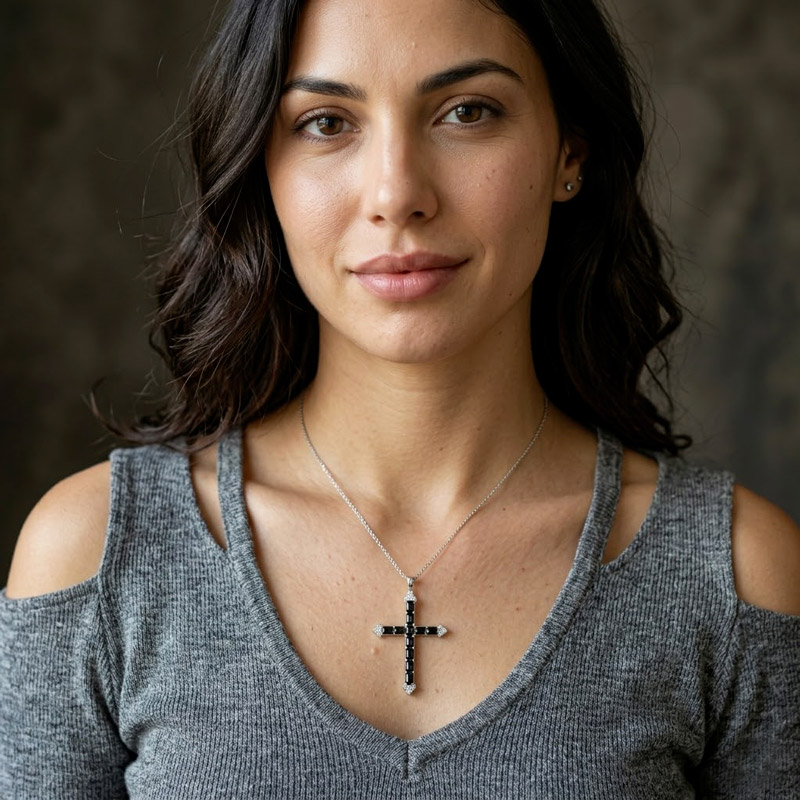 The four trefoil terminals on this cross are not just decorative. In Christian iconography, the budded cross represents the Holy Trinity at each point of the compass, a symbol that dates back to medieval heraldry and early church architecture. The three-lobed shape at each arm tip echoes the fleur-de-lis motif found on Gothic cathedrals across France and England. On this piece, each trefoil cluster is pavé-set with round brilliant-cut cubic zirconia, which creates a bright white accent against the deep black of the spinel channel. The result is a cross that feels rooted in liturgical tradition but styled for modern wear. It pairs naturally with a dark wardrobe, reads well against skin from porcelain to deep brown, and carries a spiritual weight that goes beyond aesthetics. For a baptism gift, a confirmation keepsake, or a daily devotional anchor, the budded silhouette says something specific about the wearer’s relationship with Christian heritage.