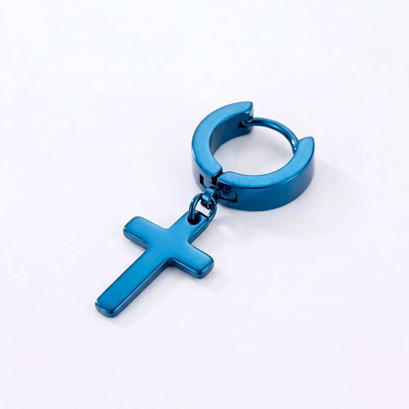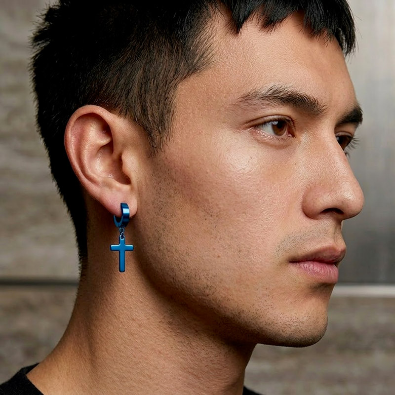 Blue carries its own spiritual symbolism across Christian tradition. It represents heaven, truth, and the mantle of the Virgin Mary in iconographic art. Wearing a blue cross is not just an aesthetic choice. It connects to a long visual language within the faith, one that predates modern jewelry by centuries. From a style perspective, the Sorin reads bold against warm skin tones and neutral wardrobes. It pairs naturally with white tees, grey hoodies, and denim. For men who already collect crosses in silver, gold, and black, blue introduces a fourth rotation option that breaks the metallic monotony while keeping the same familiar form factor. Wear one solo on the left ear for a focused accent, or rock both for a symmetrical frame along the jawline.