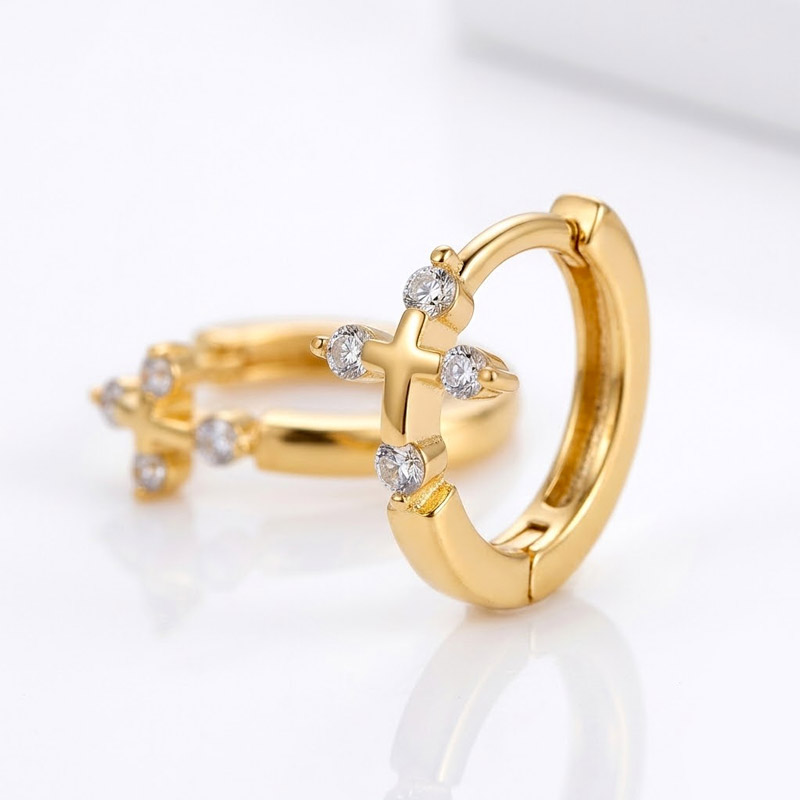 The Lumis takes the classic Latin cross and reimagines it within the architecture of a huggie hoop. Rather than dangling a cross charm from a ring, the cross itself forms the structure of the earring. Five round cubic zirconia stones sit at each terminal point of the cross, mounted in individual prong settings that let light pass through from behind. The 14K gold plating over a solid 925 sterling silver base gives the piece a warm depth that reads far above its price point. It is a design that speaks quietly but carries real presence on the ear.