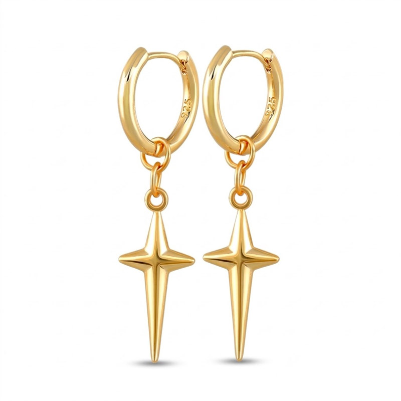 A faceted North Star cross pendant with a tapered, blade-like lower arm, suspended from an 18K gold-plated huggie hoop built on a solid 925 sterling silver core with a visible 925 hallmark.