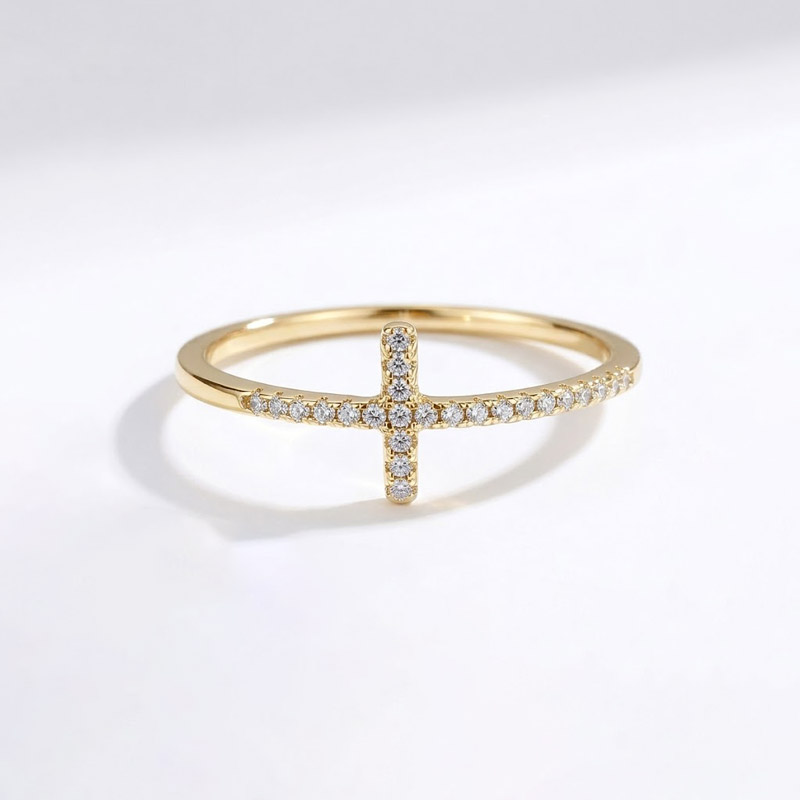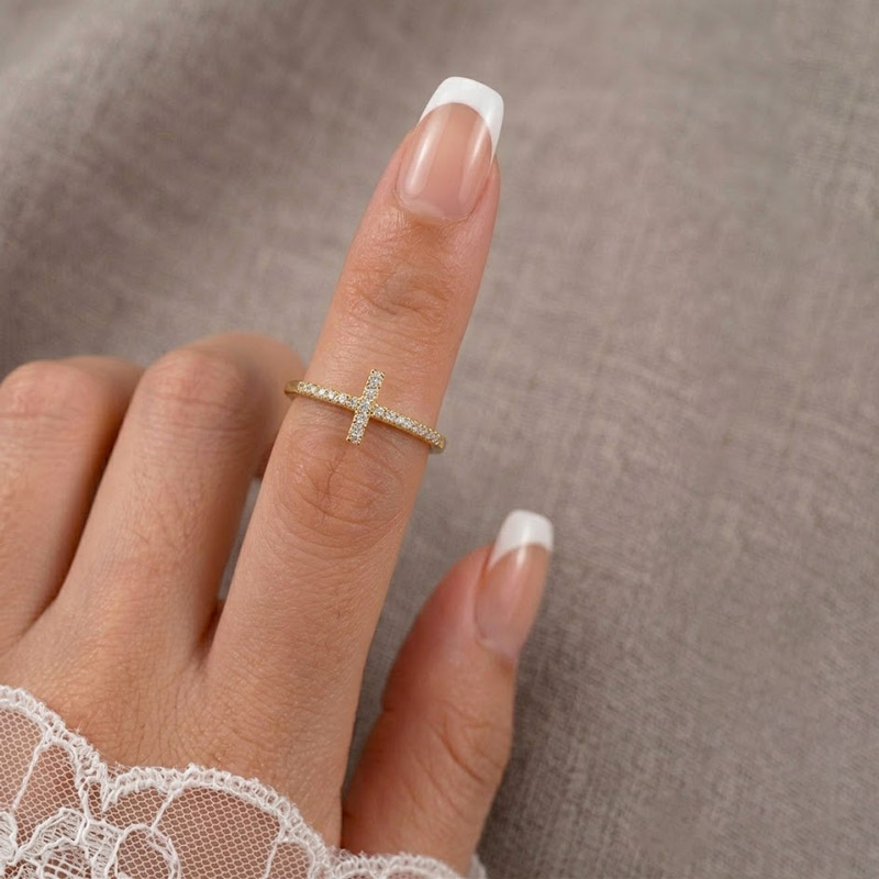 The thin band profile makes this ring a natural candidate for stacking. Pair it with a plain gold band on the same finger for a layered look, or wear it solo on your index finger where the cross sits front and center. It reads well against both casual fits and more polished outfits. For brunch, slide it on with a linen blouse and let the CZ stones do the talking. For church, it pairs cleanly with a matching gold cross pendant without competing for attention. Because the cross is oriented sideways, it follows the natural line of your hand and avoids snagging on fabrics or pockets.