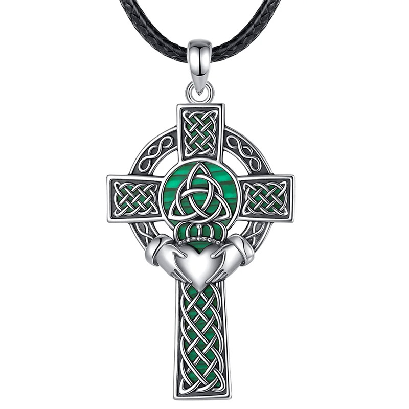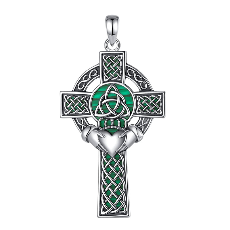Three Irish symbols converge on a single pendant: the Celtic cross, the Claddagh, and the trinity knot, all set in oxidized sterling silver with natural malachite stone running through every channel.