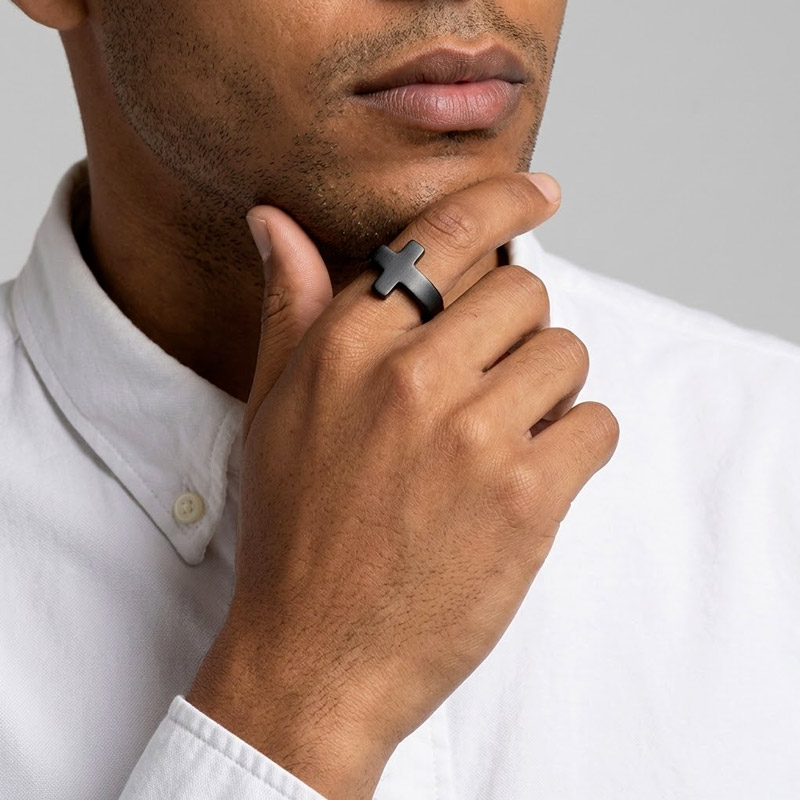 Black has its own language in men’s accessories. It reads as deliberate. It matches everything without blending into anything. A black cross ring on the hand of a man in an all-black outfit becomes part of a unified visual statement. On the hand of a man in a white shirt, it becomes a single point of contrast that draws the eye. The Konrad works across both extremes and everything between. It pairs with black leather watch straps, gunmetal bracelets, and dark tungsten bands without creating mixed-finish tension. For men who already own the gold or silver version of this ring, the black completes the rotation and gives them an option for nights, events, and moods where traditional metallic tones feel too bright. The cross symbol itself gains a different weight in black. It feels more solemn, more personal, closer to the iron crosses carried by medieval pilgrims than to the polished gold of a cathedral altar.