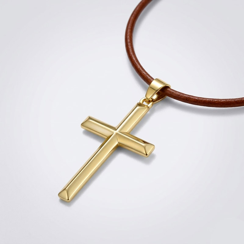 - 18K gold-plated 925 sterling silver cross pendant on a round PU leather cord, available in black or brown for two distinct visual profiles.