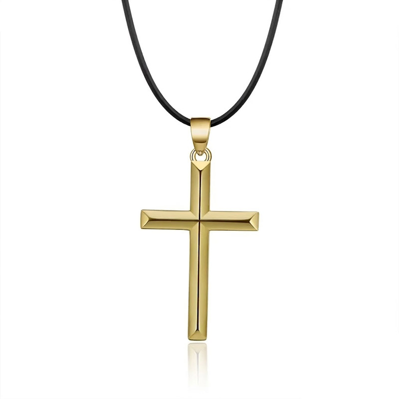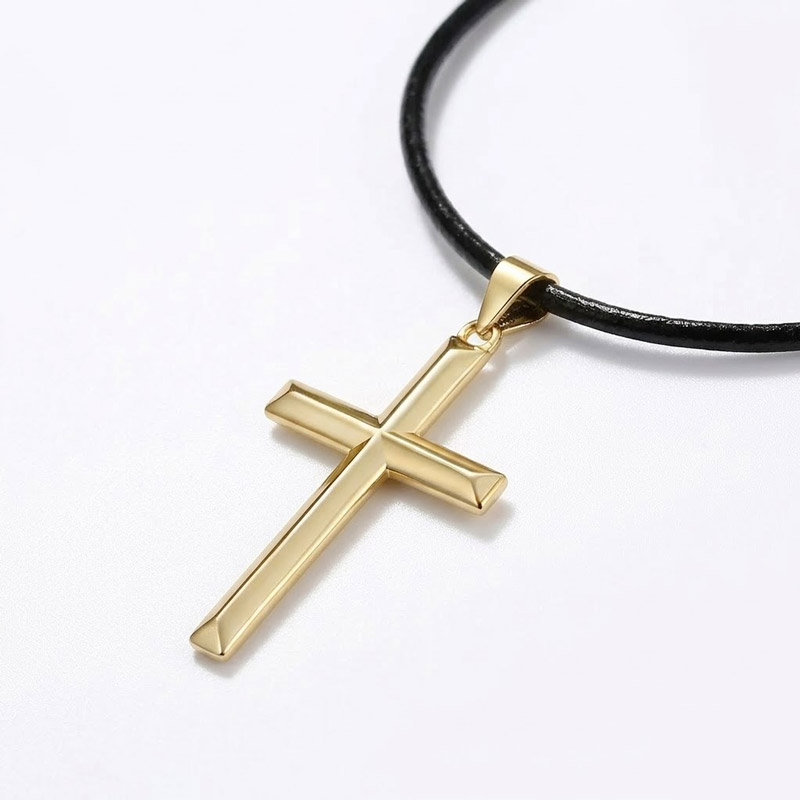 Metal chains and gold crosses are a natural pairing, but they tell a specific story. Leather tells a different one. The Tarn puts an 18K gold-plated cross on a simple cord, and the result shifts the energy of the piece from polished jewelry to personal artifact. The warm gold color of the plating sits rich against the matte surface of the PU leather, and neither material tries to outshine the other. On the neck, the cord drapes with a casual weight that a chain does not. It bends closer to the body, follows the contour of the collarbone, and lays the pendant flat against the chest rather than letting it swing. That physicality matters. A cross necklace you feel resting against your sternum carries a different kind of presence than one that dangles and catches air. The beveled edges of the Latin cross pick up warm tones under indoor lighting and shift toward a brighter gold in direct sun, giving the pendant a visual range that flat-surfaced crosses lack.