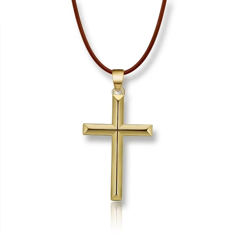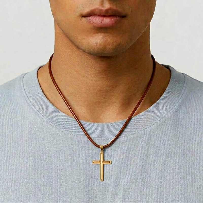 A Men’s Gold Cross Necklace on Leather