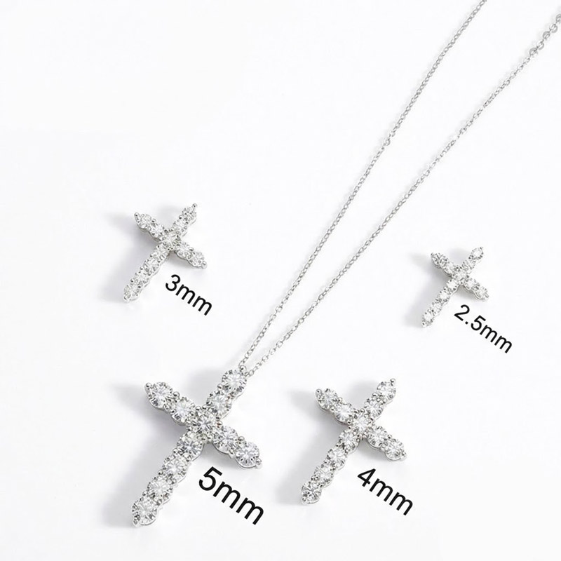 The Selah places eleven round brilliant moissanites along the clean axis of a Latin cross, each stone seated in a shared-prong gallery that minimizes metal and maximizes light. The result is a cross that reads as a single, luminous form rather than a row of individual gems. The 925 sterling silver core provides structural integrity while the 18k white gold plating adds that cooler, brighter surface tone that pairs naturally with white, yellow, or rose gold pieces already in your rotation. Four stone size options let you choose the scale that fits your style: the 2.5mm delivers a quiet, refined glow suited to professional settings, while the 5mm at 5.5 cttw throws serious fire and carries real visual weight at the neckline.