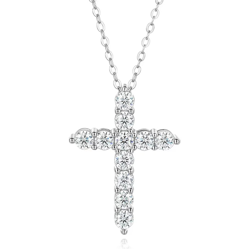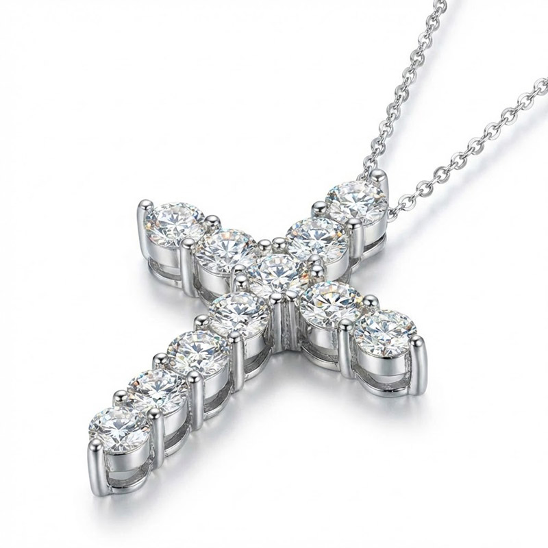 Eleven GRA-certified moissanite rounds set in shared prongs on a white gold-plated sterling cross, built for the kind of light that stops a conversation.
