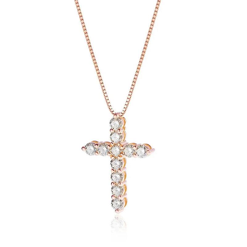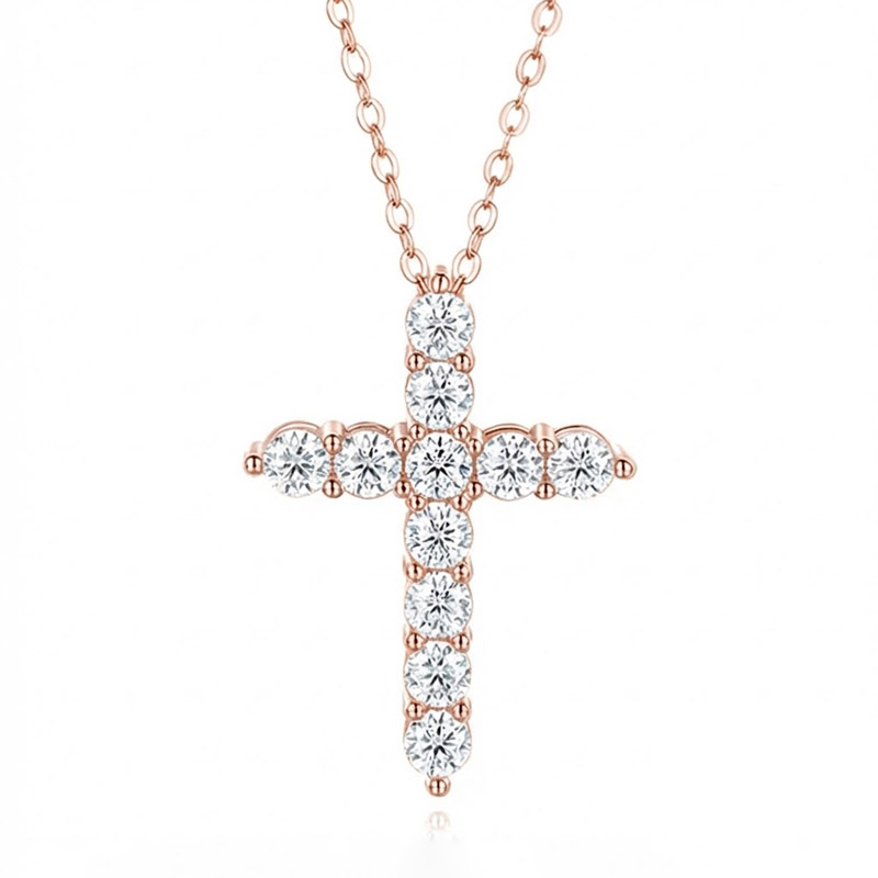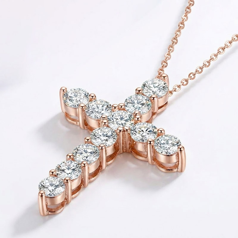 A rose gold cross necklace carrying eleven GRA-certified moissanites in a warm 18k plating that softens the brilliance without dimming it.