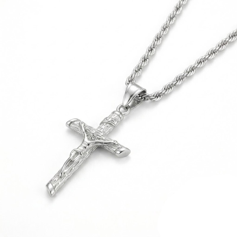Silver steel gives this crucifix a different gravity than gold. It reads quieter, more solemn. The corpus detail is identical, but the bare metal pulls your eye into the texture rather than the shine. On a rope or curb chain against a dark shirt, it looks like something passed down, not something bought last week.